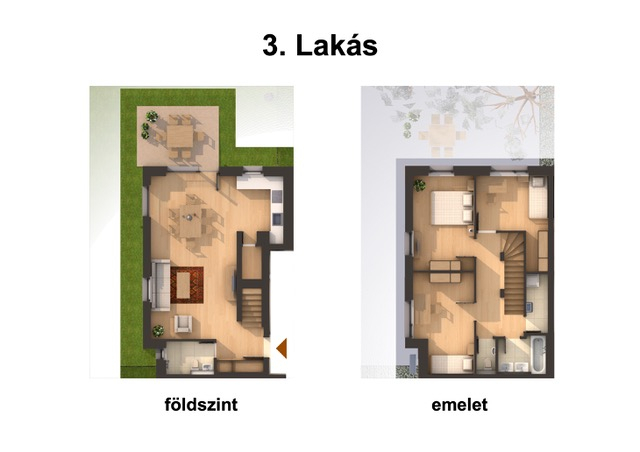 A lakás két szinten helyezkedik el, egy 15 négyzetméteres burkolt földszinti terasszal, egy 138 négyzetméteres saját kerttel és két saját parkolóval rendelkezik. A földszinten egy előszoba, egy tágas konyha-étkező-nappali, egy kamra, valamint egy fürdőszoba található. Az előszobából vezet fel a lépcső az emeleti, kényelmes előszobába, ahonnan egy fürdőszoba WC-vel, 3 hálószoba, valamint egy háztartási helyiség nyílik.
