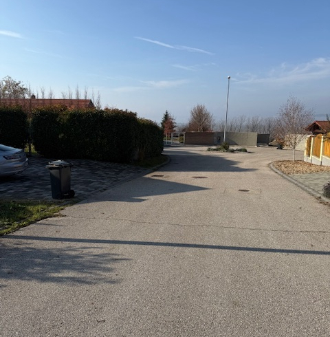 Környezete már beépült, aszfaltos utcában, kandeláberes világítással.