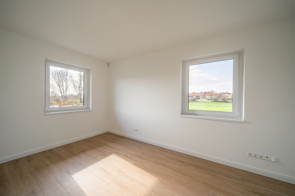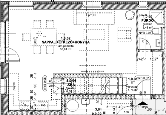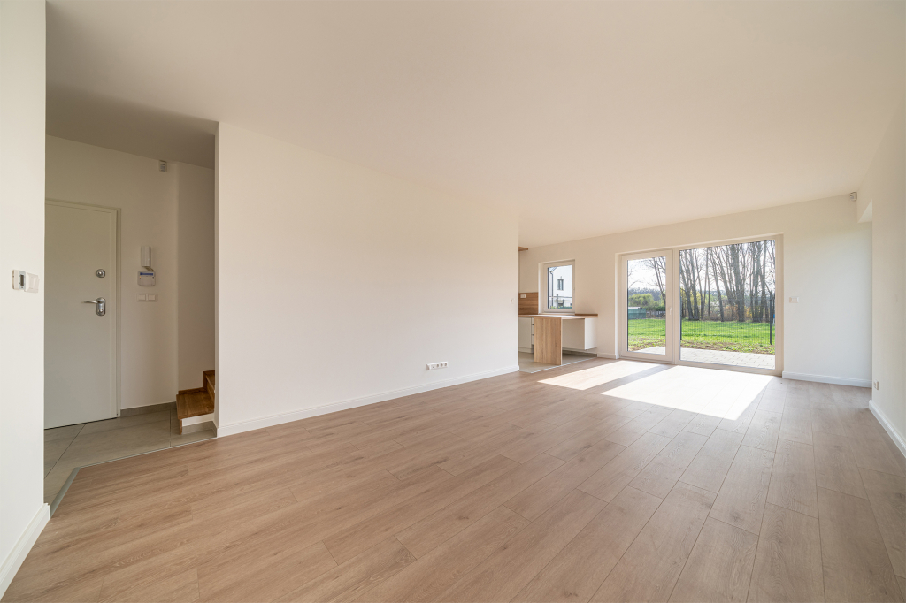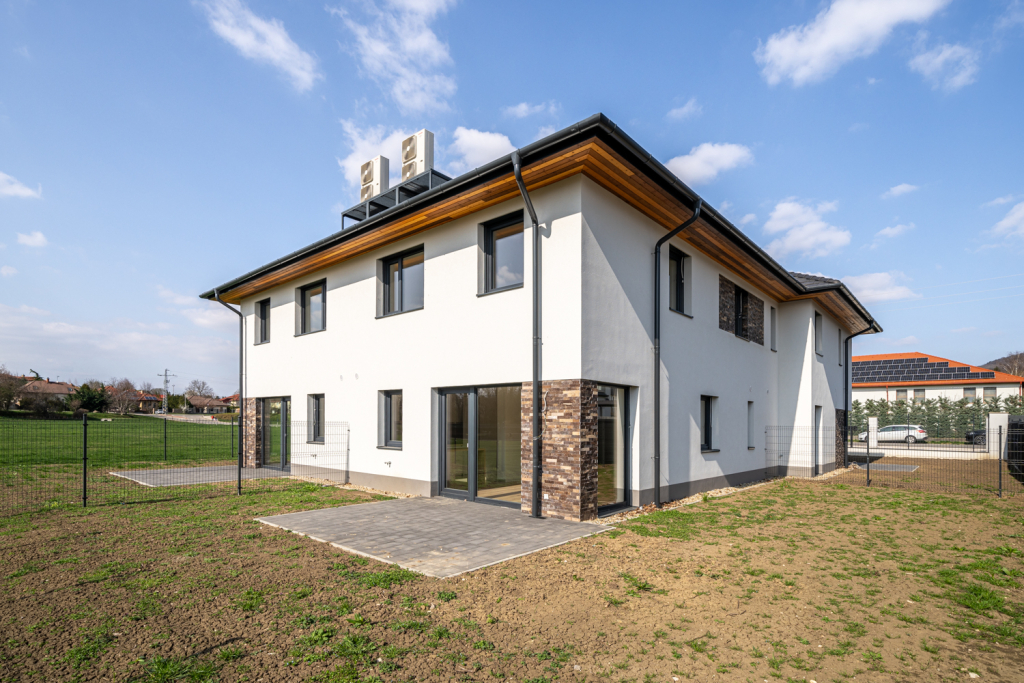 A lakás két szinten helyezkedik el, egy 15 négyzetméteres burkolt földszinti terasszal, egy 154 négyzetméteres saját kerttel és két saját parkolóval rendelkezik. A földszinten egy előszoba, egy tágas konyha-étkező-nappali, egy kamra, valamint egy fürdőszoba található. Az előszobából vezet fel a lépcső az emeleti, kényelmes előszobába, ahonnan egy fürdőszoba, egy külön WC, 3 hálószoba, valamint egy háztartási helyiség nyílik.