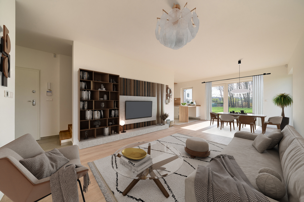 Egyedül a nappali és a 3 hálószoba nem került berendezésre, hisz azokat mindenki saját, egyedi ízlése alapján képzeli el, ám a képek között ezekre a szobákra is találhatóak potenciális berendezési lehetőségek. A valós, üres szobák képei után találhatóak a digitálisan berendezett szobák szerkesztett képei.