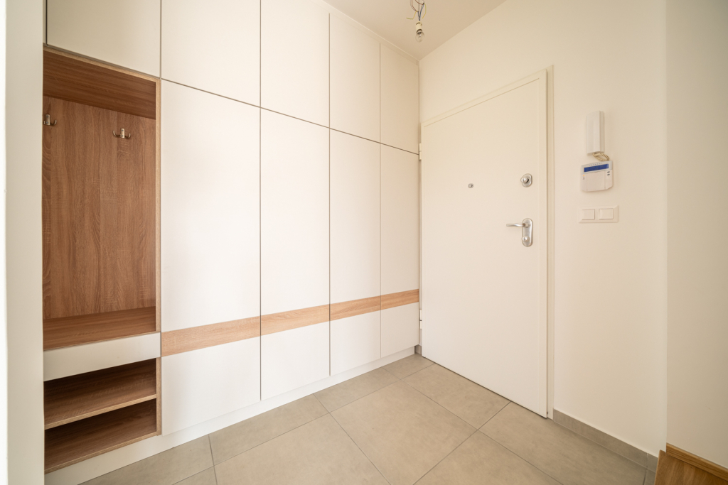 Az előszoba szintén rendelkezik beépített szekrénnyel, ezen kívül a lakás riasztó- és kaputelefon rendszere is kiépítésre került.